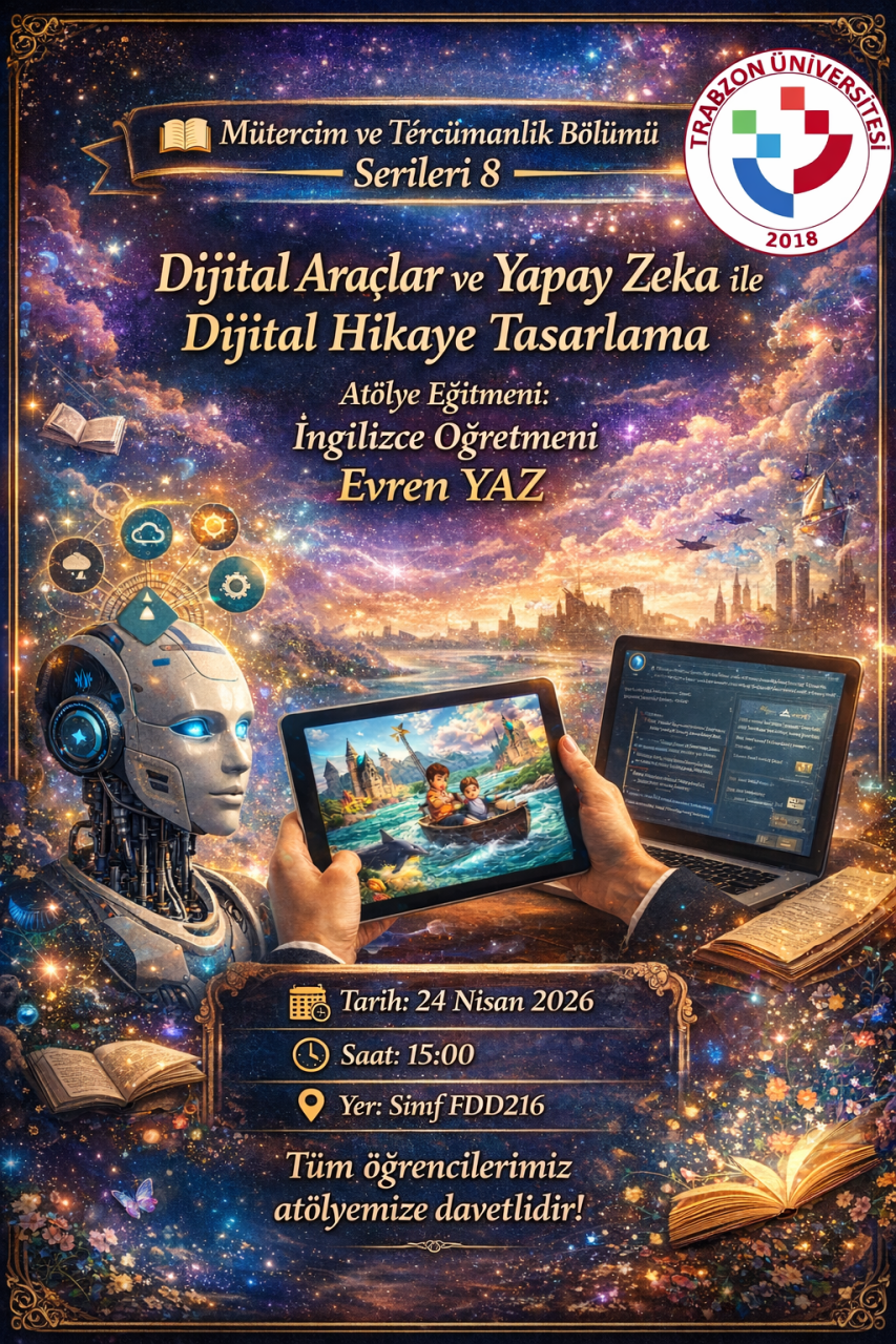 Trabzon Üniversitesi Mütercim ve Tercümanlık Bölümü Seminer Dizisi kapsamında düzenlenen 8. etkinlikte, “Dijital Araçlar ve Yapay Zeka ile Dijital Hikâye Tasarlama” başlıklı atölye gerçekleştirilecektir. Atölye, dijital çağın anlatı olanaklarını yapay zekâ destekli araçlarla bir araya getirerek katılımcılara yaratıcı ve uygulamalı bir öğrenme deneyimi sunmayı amaçlamaktadır.